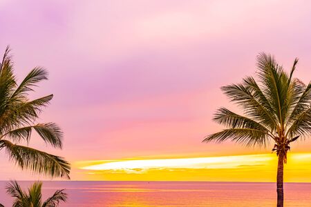 Beautiful sea ocean beach with palm tree at sunrise time for holiday vacation