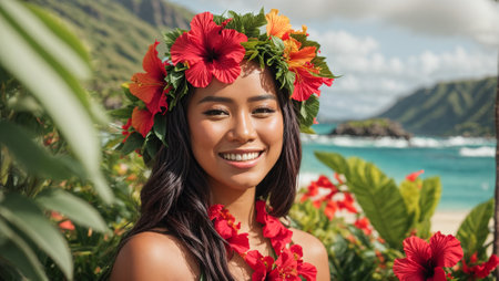 Portrait of a beautiful young Hawaiian woman, smiling, flowers
