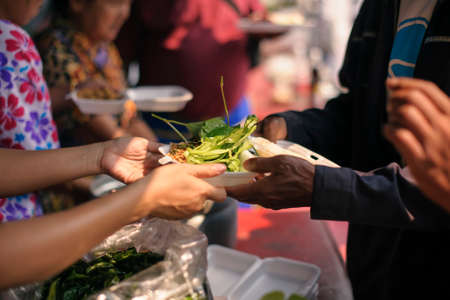 Hand-feeding to the needy in society : Concept of Feeding : Volunteers give food to the poor : donating food is helping human friends in society : Helping People With Hunger With Kindness