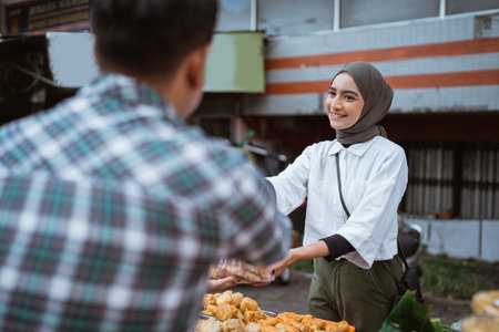 A beautiful girl wearing a headscarf selling a food stall on the side of the road gives takjil food to a buyer at the stall