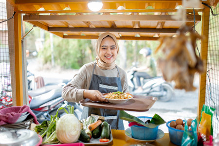 muslim woman taking her food order from chicken satay street food seller