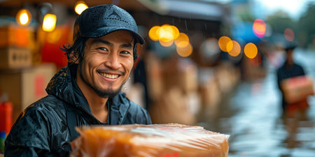 A compassionate man distributes Iftar meals to the needy during Ramadan This act of kindness embodies the spirit of Islam, spreading compassion and generosity throughout the community The image captures the essence of giving back and sharing blessings during this sacred month AI Generative