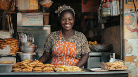 A warm and friendly African woman with a big smile proudly stands behind a stall of fresh, traditional food, symbolizing entrepreneurship and local business.