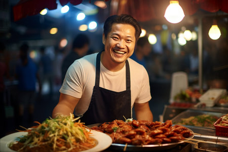 asian street seller selling food on market