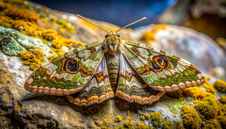 A stunningly detailed moth displays its ornate, map-like wing patterns while resting on a moss-covered stone.