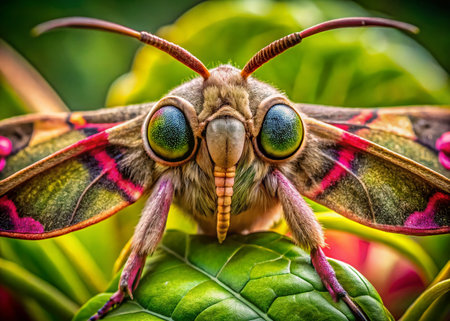 a moth sitting on top of a green leaf in front of a blurred window with sunlight shining through the wings. Generative Ai