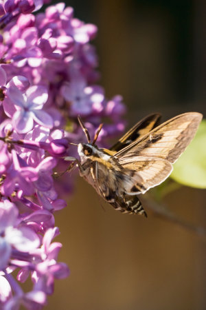 A large moth sits on a lilac and drinks nectar