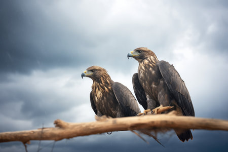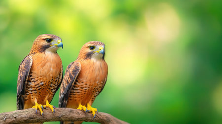 Two majestic hawks perched on a branch against a vibrant green background in their natural habitat.