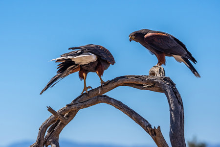 Two birds of prey sitting on a rock in the Arizona desert.