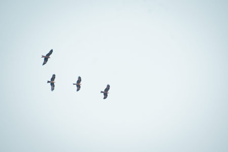 Black Kite birds (Milvus migrans) flying freely in the open sky, captured both in group formation and solo flight.
