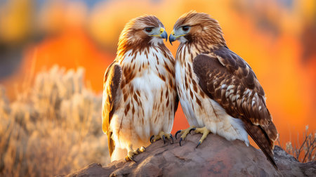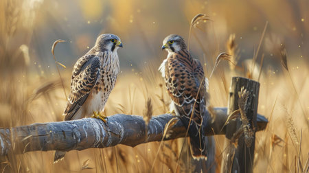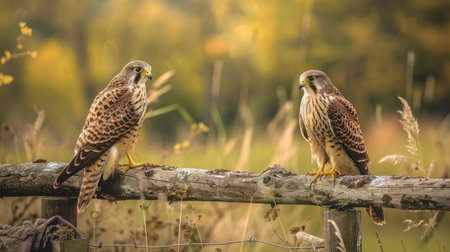Pair of kestrels perched on a rustic fence in a meadow, their keen eyes scanning the surroundings