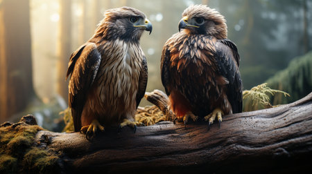 hawks and eagles nesting in orcas bay, norfolk harbour. this characterful animal portrait by roger deakins captures the beauty of these majestic birds in their natural habitat. the photo, taken with provia film, showcases the artistic style of guercino, highlighting the wood textures and creating a balanced composition. the shallow depth of field adds a captivating touch to the image. ai generated