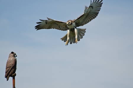 Immature Red Tailed Hawk Attacking Artificial Owl