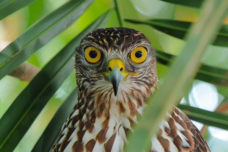 Curious Hawk, Tropical Palm Tree Perch Piercing Yellow Eyes of a Majestic Raptor in Nature