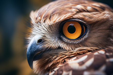 Focusing on the intense gaze of a hawk, this close view captures the vivid orange eyes and razor-sharp beak. The textured feathers add depth, highlighting the bird's powerful presence.