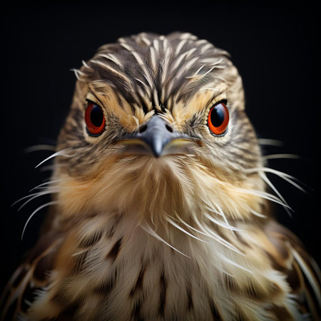 a dark fantasy bird with striking red eyes stares out from the hyperrealistic portrait. captured with the zeiss batis 18mm f2.8 and voigtlander nokton 50mm f1.5 aspherical lenses, this explosive wildlife image evokes cosmic horror and the eerie world of darksynth. keywords: bird, red eyes, dark fantasy, zeiss batis 18mm f2.8, voigtlander nokton 50mm f1.5 aspherical, hyperrealistic animal portraits, cosmic horror, explosive wildlife, darksynth. ai