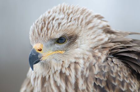 Close-up animal portrait of eagle or falcon on gray background, macro.