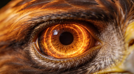 A creative digital illustration depicting High-quality commercial art of abstract eagle eye as concentric fiery amber rings, intense close-up composition, piercing central glow, vigilant and hypnotic style. This AI-generated artwork features unique visual elements suitable for various commercial and editorial applications. AI-generated illustration.