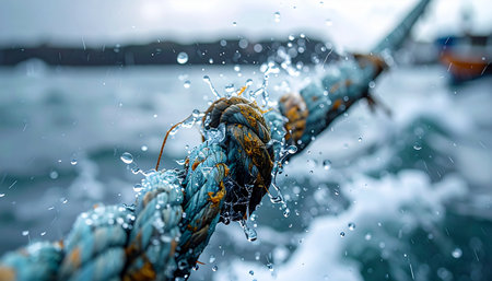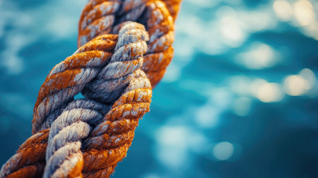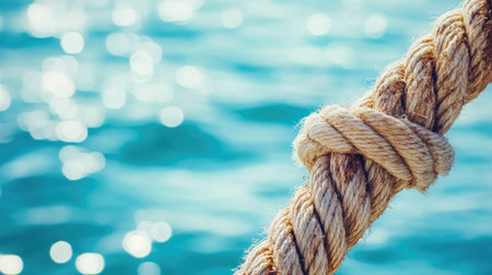 A beautiful close-up image featuring a twisted rope knot against a shimmering blue water background, capturing the essence of maritime life and adventure.