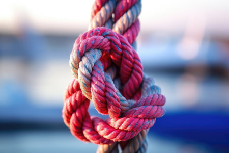 macro shot of a reef knot on a thick rope with blurred sail background, created with generative ai