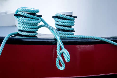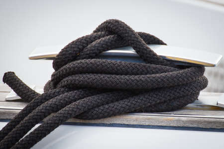 Closeup picture a rope tied to a metal cleat on a yacht deck closeup