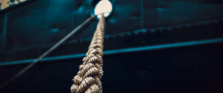 mechanical equipment for mooring a commercial ship at port, including a winch and mooring line, with a copy space picture. Area for design or text addition.