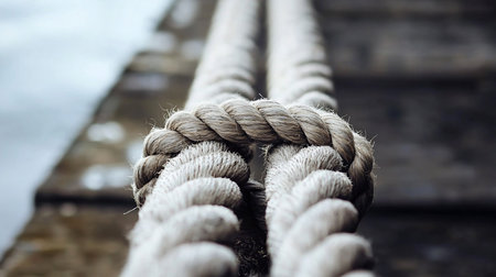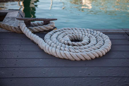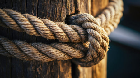 Thick marine rope on wooden pier in harbor, symbolizing strength, shipping industry, and maritime safety.