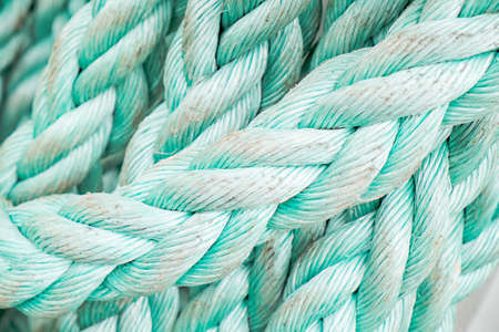 A close-up, selective focus shot of a thick, heavy-duty mooring rope. The twisted strands and rough, weathered, frayed texture of the natural fibers are prominent.