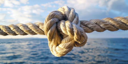 A close-up of a knot in a thick rope, set against the backdrop of a calm ocean and a partly cloudy sky. High quality photo