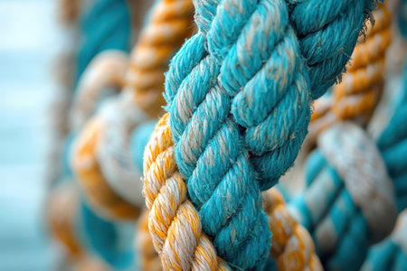 Close view of intertwined ropes displaying vibrant blue and yellow hues against a blurred water backdrop showcasing texture and craftsmanship.