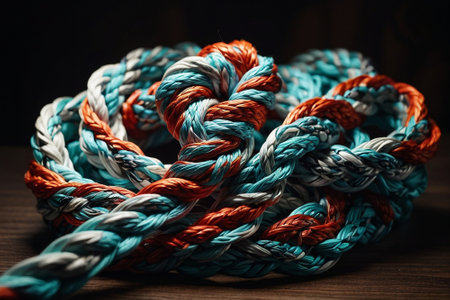 Close-up view of braided ropes in vivid blue, pink, and orange colors showcasing the intricate texture and interwoven design, symbolizing strength, unity, and resilience, making it ideal for creative concepts and stock photography. Generative AI