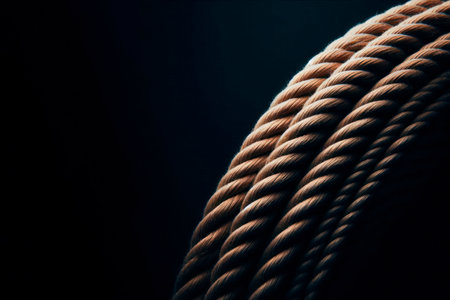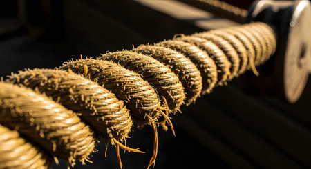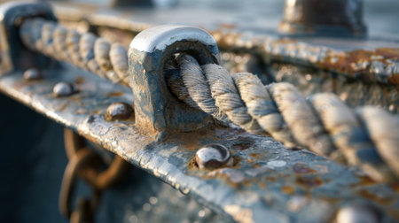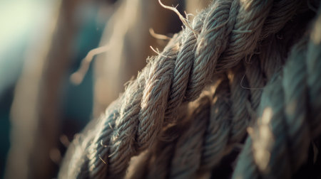 A beautifully captured close-up of twisted rope with soft sunlight illuminating its texture against a serene nautical background, invoking a sense of adventure.