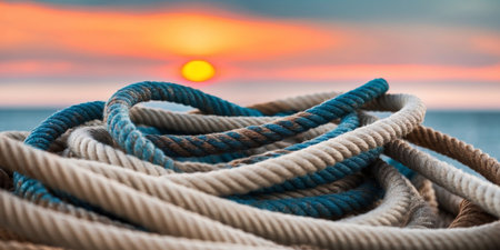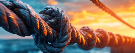 AI Generated. Close up nautical ropes and their role in maritime transport at sunset