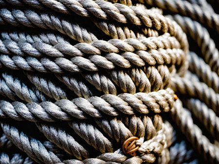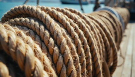 A close-up view of thick, coiled ropes resting on a wooden dock, with a serene blue water backdrop. The image captures the essence of maritime life, showcasing the intricate textures and natural fibers of the ropes, evoking a sense of adventure and tranquility.