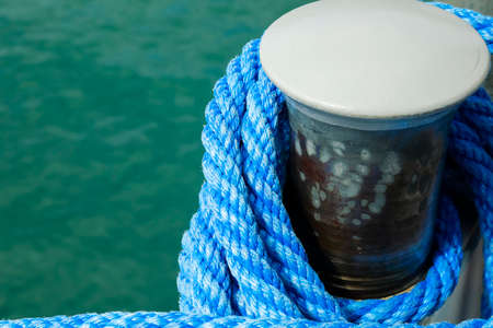 Jetty objects concept. New metal steel harbor marina bolts with ship and boats ropes.