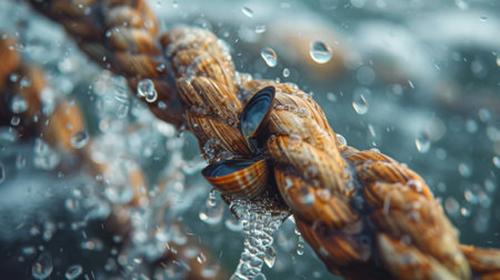Close up of a Rope With Mollusks and Water Droplets in a Seaside Environment During Daylight. Generative AI