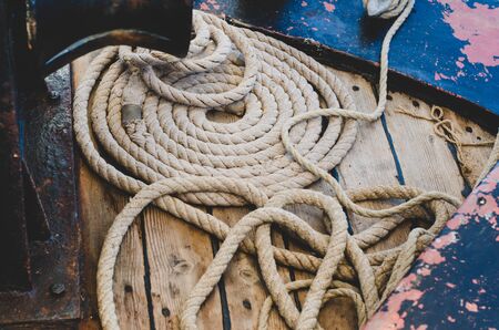 Thick rope in spiral or ring shape on a wooden sailing ship floor