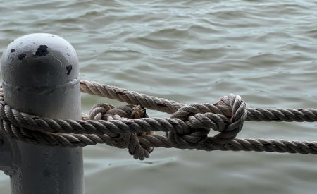 Heavy cargo ship moored at port with secure nautical rope knot on rusty bollard