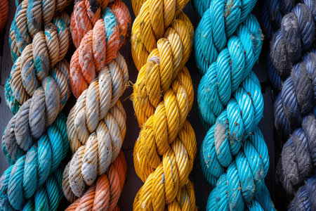 A detailed photograph of various colors and textures of old fishing rope, arranged in an aesthetically pleasing composition. the ropes appear weathered with signs of wear but still have their natural beauty.