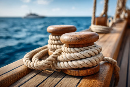 Nautical rope coiled around wooden cleats on a sailboat deck over blue sea