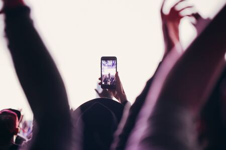 A person recording a concert with cellphone. Selective focus. Copy space.