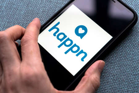 Young woman holding a smartphone with Happn dating app on screen. IPhone 11 with a social media chatting and meeting new people app logo.