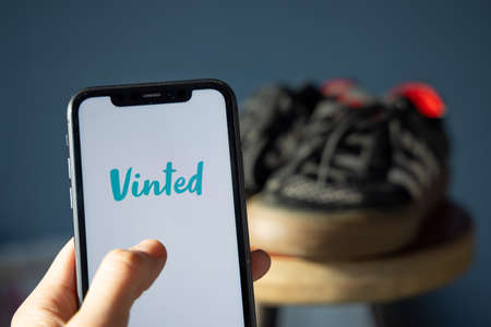Closeup of male hand holding smartphone with logo lettering of vinted on screen