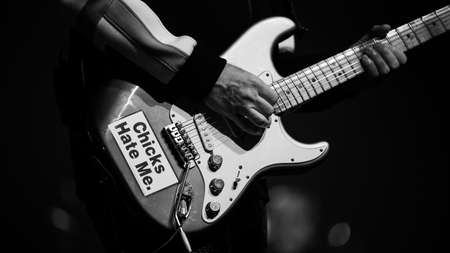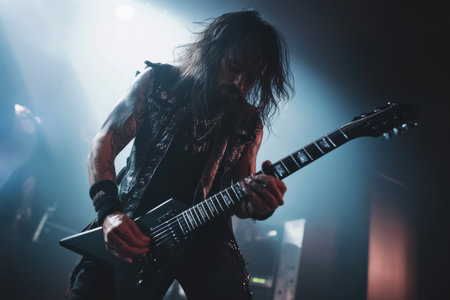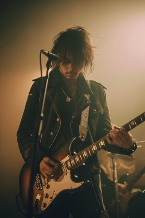 Young male guitarist playing electric guitar on stage during live music concert