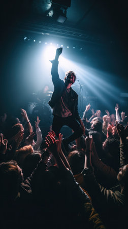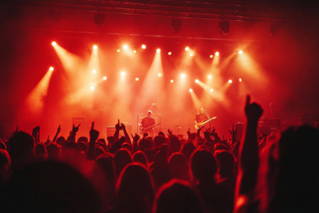 Stage lights and crowd of audience with hands raised at a music festival. Fans enjoying the party vibes.