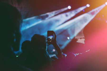 Close up of recording video with smartphone during a concert. Toned picture