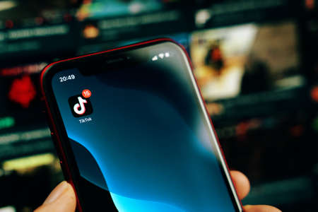 Bishkek, Kyrgyzstan - March 14, 2020: TikTok app. Tik Tok application icon on iPhone screen. Tiktok Social media network.