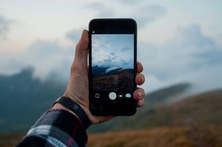 capturing beautiful mountain landscape with cloud on smartphone. man holding his smartphone capturing mountains. Travel photography