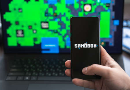 Russia Moscow 30.05.2021.Logo, screenshot of blockchain nft ethereum cryptocurrency game Sandbox in laptop, mobile phone.Man playing with crypto coins, token sand.Earning digital money.Lands, heroes.