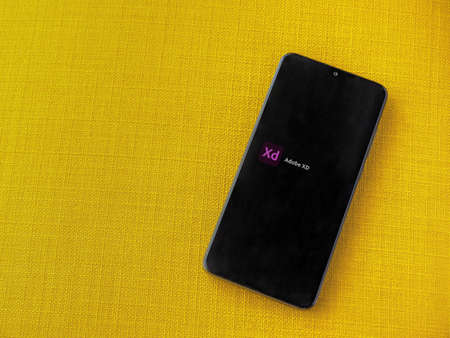 Lod, Israel - July 8, 2020: Adobe XD app play store page on the display of a black mobile smartphone on a yellow fabric background. Top view flat lay with copy space.